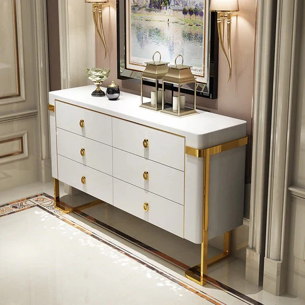 The Aurum & Ivory Sideboard Cabinet is a stylish and practical storage solution for your dining or kitchen area. Crafted from sturdy wooden MDF and finished in a smooth white PU, this cabinet offers a clean and elegant look. The addition of golden molding along the top and bottom edges brings a touch of luxurious detail, creating a versatile and gorgeous aesthetic. It features six spacious drawers, providing ample room to neatly organize your cutlery and kitchen accessories. The cabinet is elevated by a durable stainless steel stand, adding a modern touch and ensuring stability. This sideboard seamlessly blends functionality with sophisticated design, making it a beautiful and useful addition to your home.