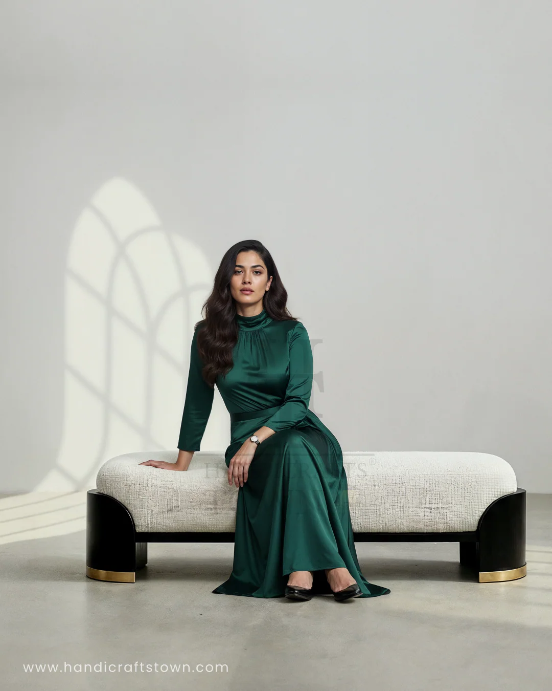 The Belmora Curve Bench redefines modern sophistication with its sculpted silhouette and luxurious contrast. Featuring a softly textured ivory cushion resting atop a sleek black curved base with golden accents, this bench becomes the statement of refined taste.