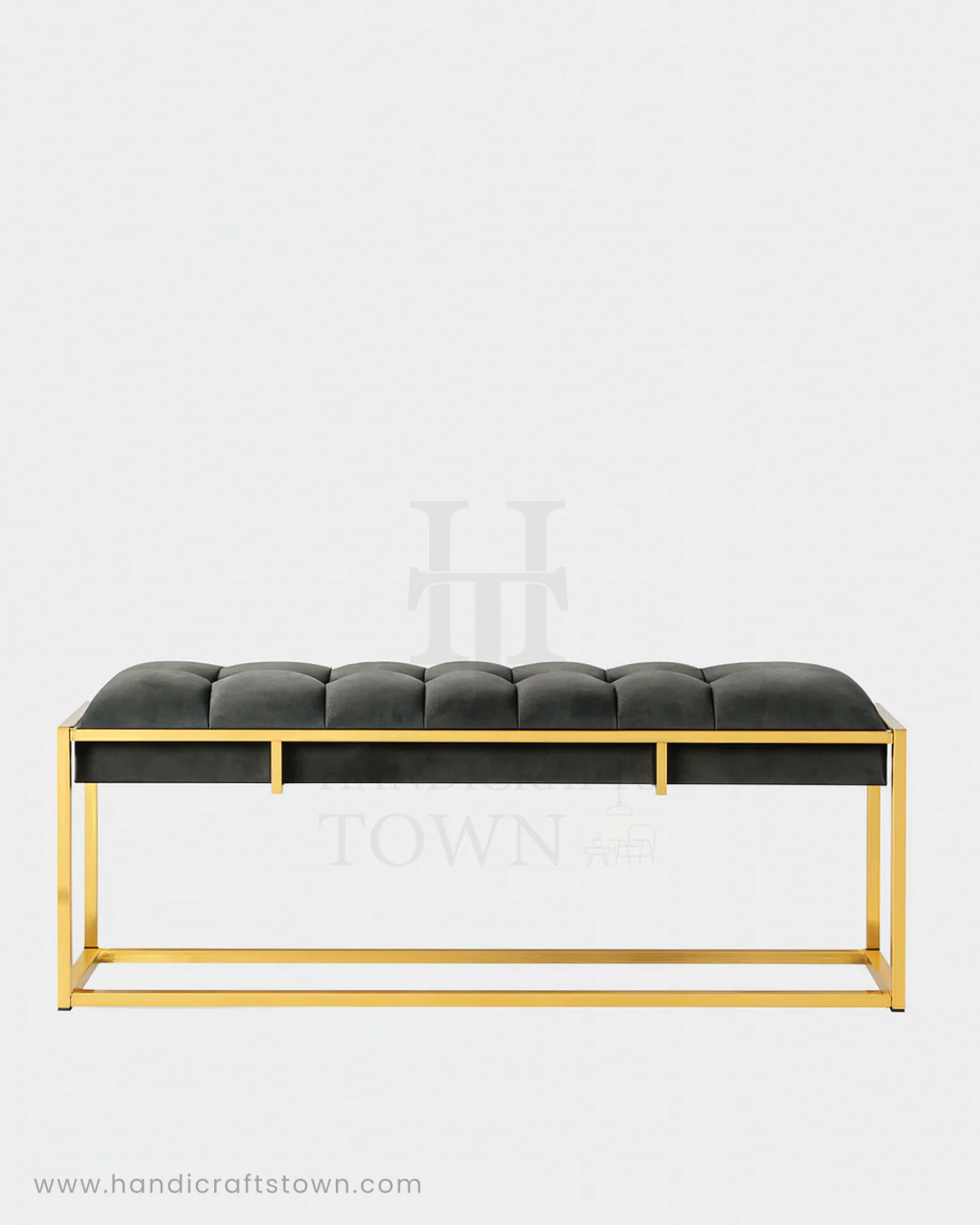 Elevate your interiors with the timeless elegance of the Golden Vista Bench. Featuring a plush, tufted velvet seat in a deep charcoal hue, this bench pairs ultimate comfort with sophisticated style. Its sleek gold-finished metal frame adds a touch of opulence, creating a striking contrast that catches the eye. Perfect as an entryway accent, bedroom statement piece, or living room seating, the Golden Vista Bench blends luxury with versatility, making it a must-have for modern homes.