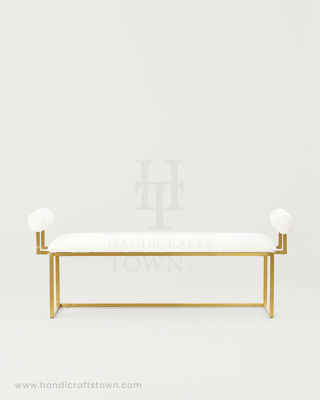Elevate your interiors with the HaloRest Bench — a seamless fusion of modern elegance and sculptural design. Featuring plush boucle upholstery and cylindrical bolster arms, this bench offers both comfort and character. The sleek gold metal frame adds a touch of luxe, making it a standout accent in bedrooms, living rooms, or entryways. Whether styled at the foot of a bed or along a hallway, HaloRest brings refined sophistication to any space.