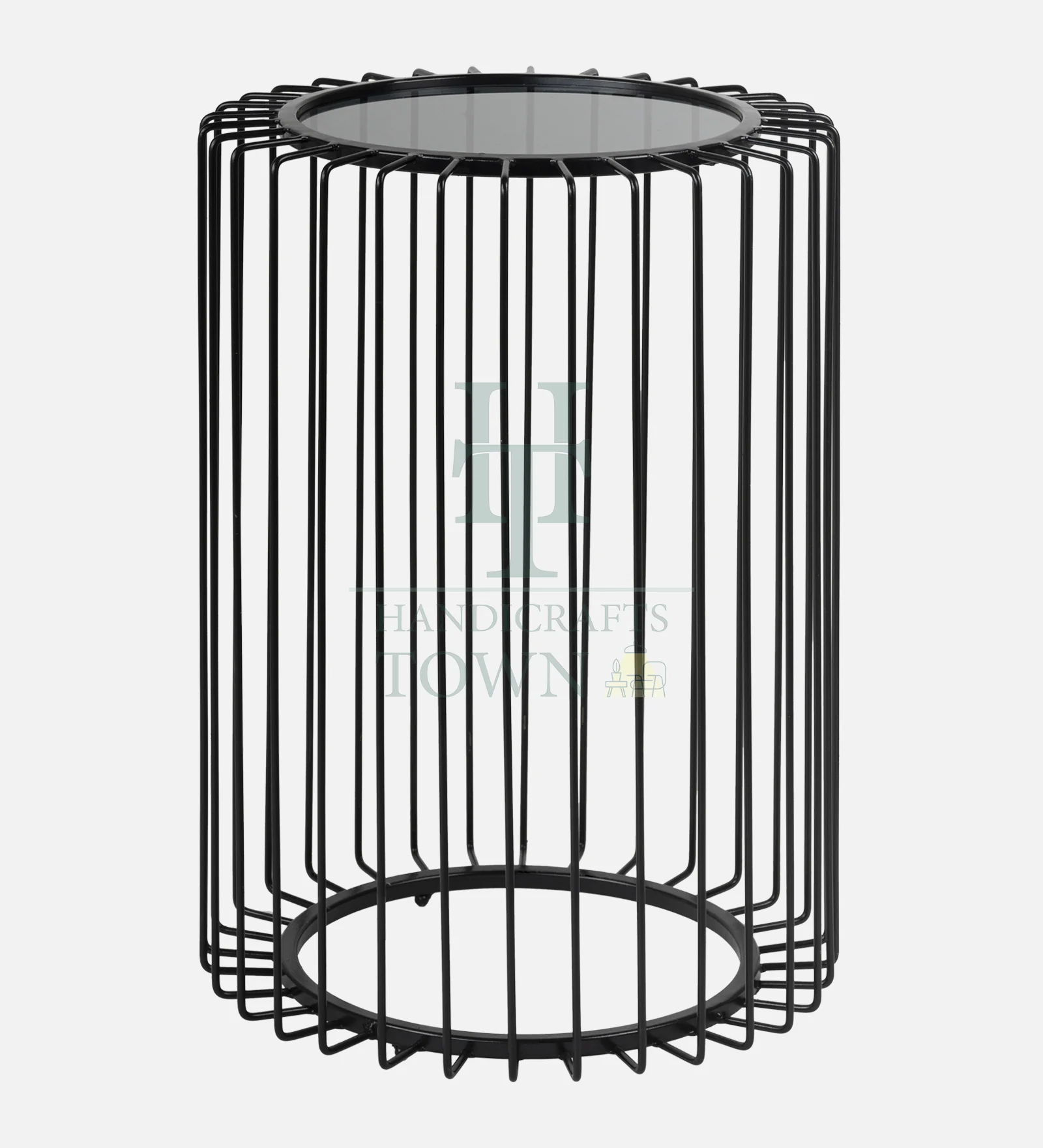 A metal cage side table with a glass top is a type of furniture that combines functionality and style. It features a metal cage base in black, which provides an open and airy design, while the glass top provides a smooth and elegant surface.