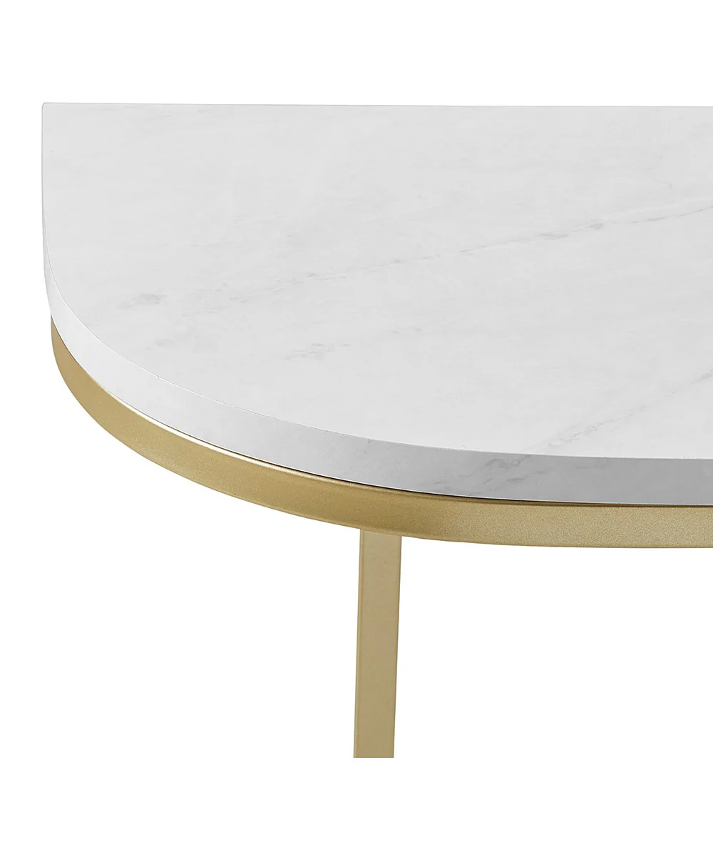 Introducing the Rectangular Gold Metal Console Table, a captivating symphony of luxury and modern design. This stunning piece is not just a table, it's a statement, a conversation starter, and a timeless addition to your home. The console base gleams with a warm, sophisticated golden finish, reflecting the light and adding a touch of opulence to your space. The white composite marble top creates a beautiful counterpoint, offering a cool, sleek surface that give out an air of understated luxury.