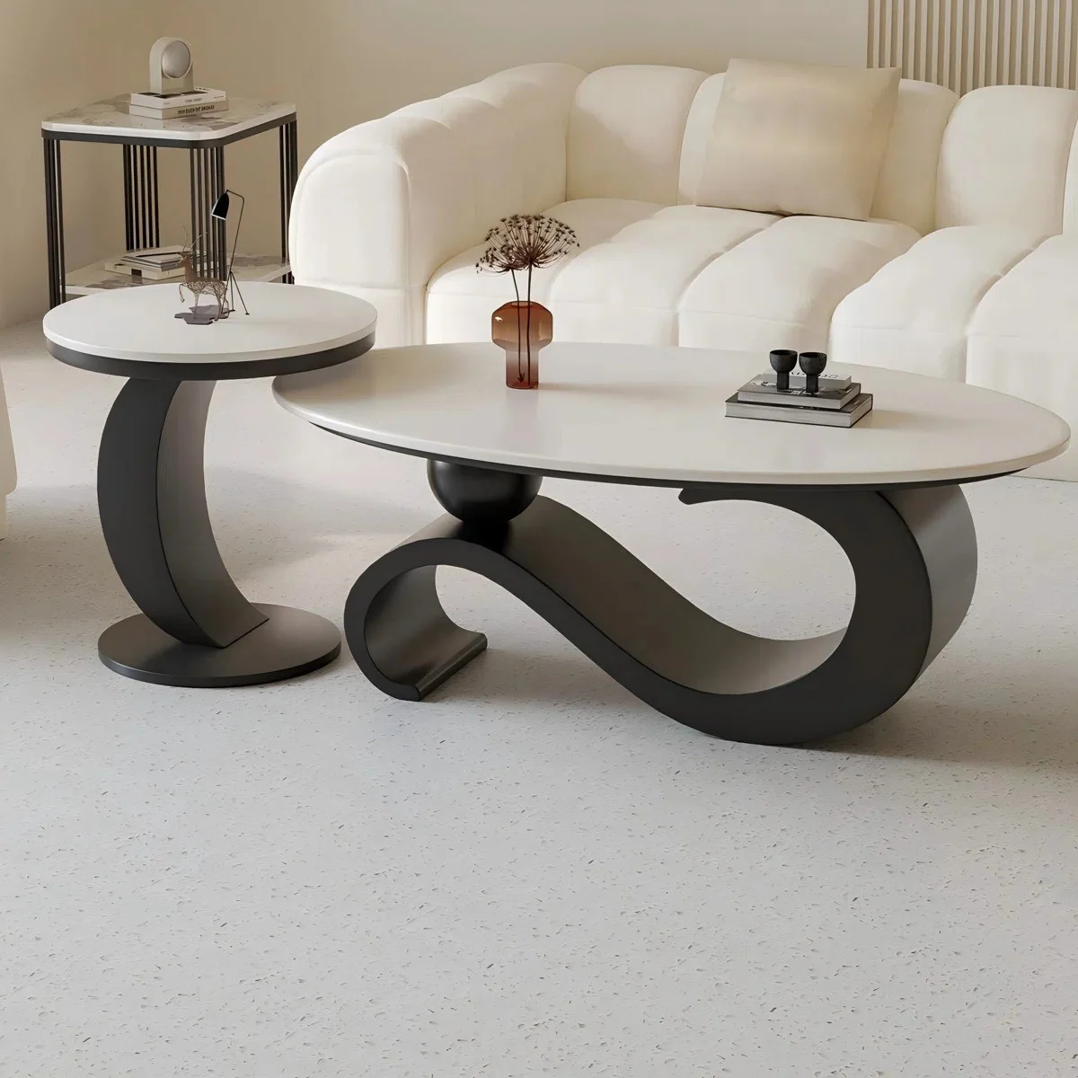 The Inox Centre Table Set is a triumph of modern sculpture and functional design, offering an immediate focal point for any contemporary living space. This versatile two-piece collection combines the durability of stainless steel with the timeless luxury of white composite marble, resulting in a striking, high-contrast statement. Â Centre Table: The main table features a dynamic, sweeping S-curve base that exudes movement and artistry. This sculptural base is masterfully balanced by a spherical steel accent at its center, creating an effect of poised elegance and robust stability. The companion piece is a sleek, modern side table with a bold half-moon arc base. This minimalist structure perfectly complements the complexity of the larger piece while maintaining the set's continuous, fluid design language. Both tables are crowned with a smooth, bright white composite marble top, providing a beautiful visual counterpoint to the deep black base. The use of stainless steel ensures exceptional stability and longevity, while the matte black finish provides a refined, non-reflective aesthetic that suits any modern, luxury interior.